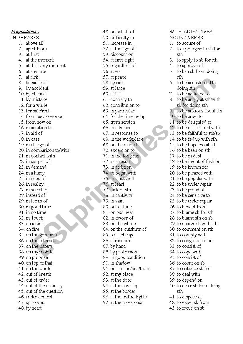 Prepositions List ESL Worksheet By Kamap