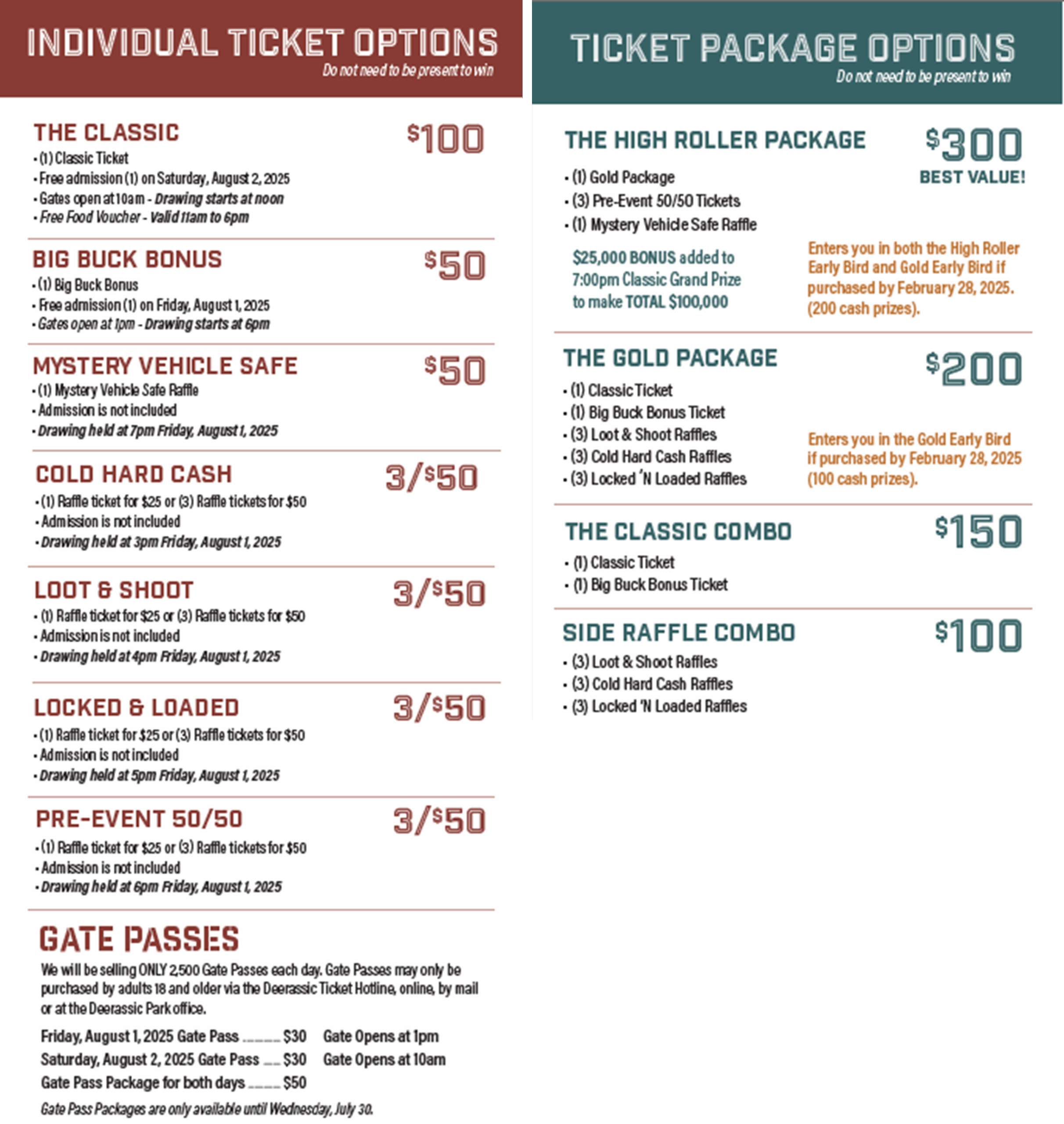Our prize list printables provide you with all the information you need to know about the amazing prizes that are up for grabs at the 2026 Deerassic Classic. From top-of-the-line outdoor gear to cash prizes and more, there’s something for everyone to compete for. With these printables in hand, you can stay organized and focused on your goal of winning big!