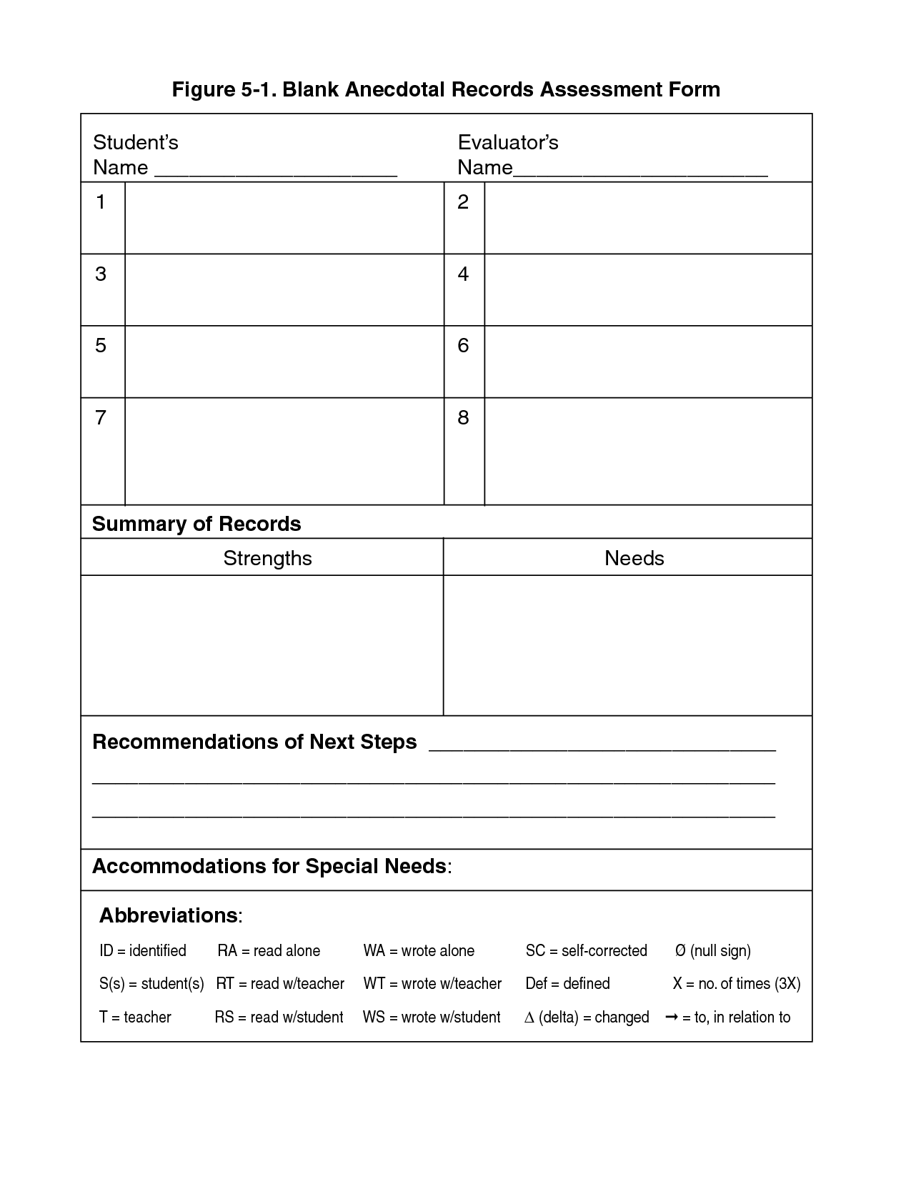Blank Printable Student Anecdotal Record Sheets