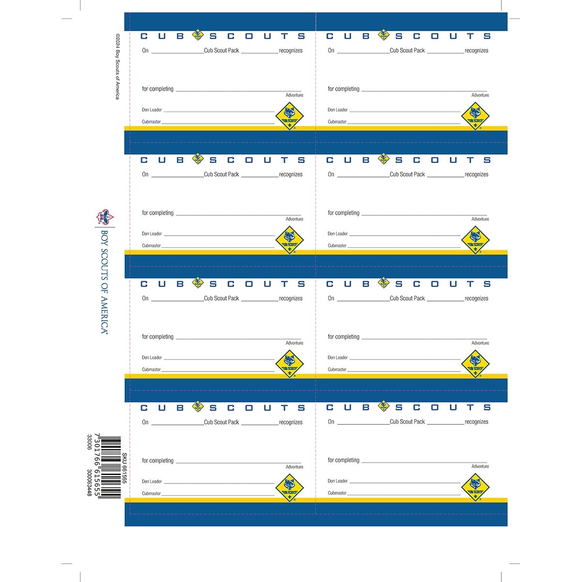 Cub Scout Adventure Pocket Certificate 1 8 Count Sheet Boy Scouts Of America