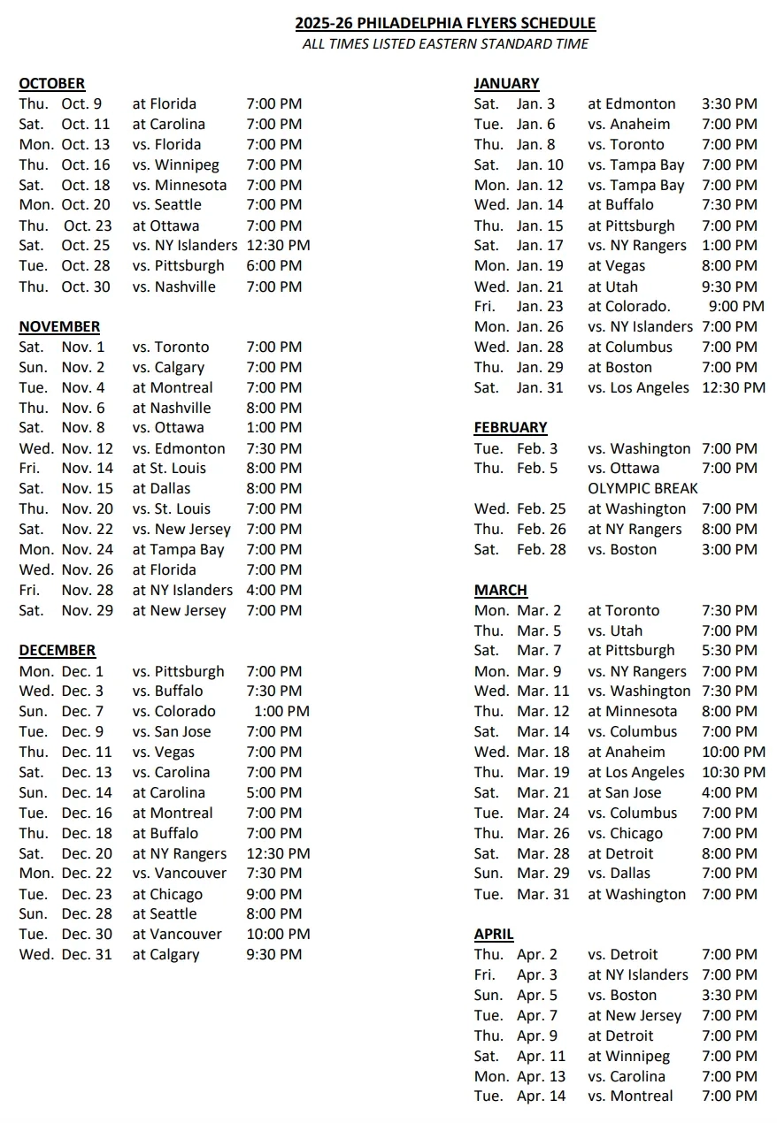So what are you waiting for? Download your Flyers Schedule 2025-26 Printable now and start counting down the days until the puck drops. Let’s go Flyers!