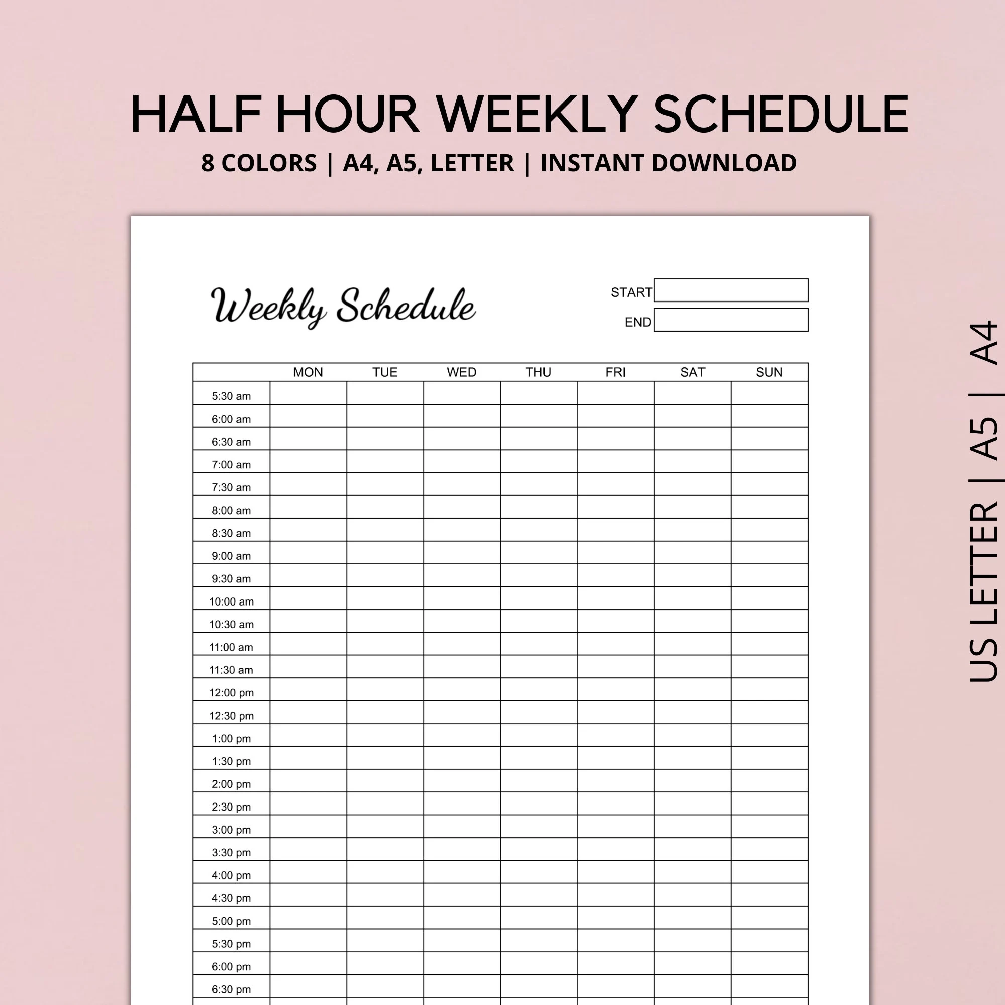 Our printable half-hour schedule template is designed to be easy to use and customizable to fit your unique needs. Whether you’re a student trying to balance classes and extracurricular activities, a busy professional juggling work and personal life, or just someone looking to stay organized, this template is perfect for you.