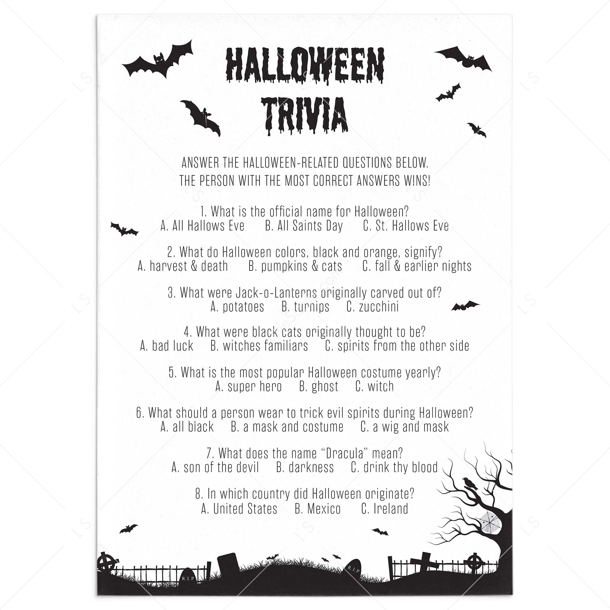 Halloween Trivia With Answers Printable Black White Graveyard LittleSizzle