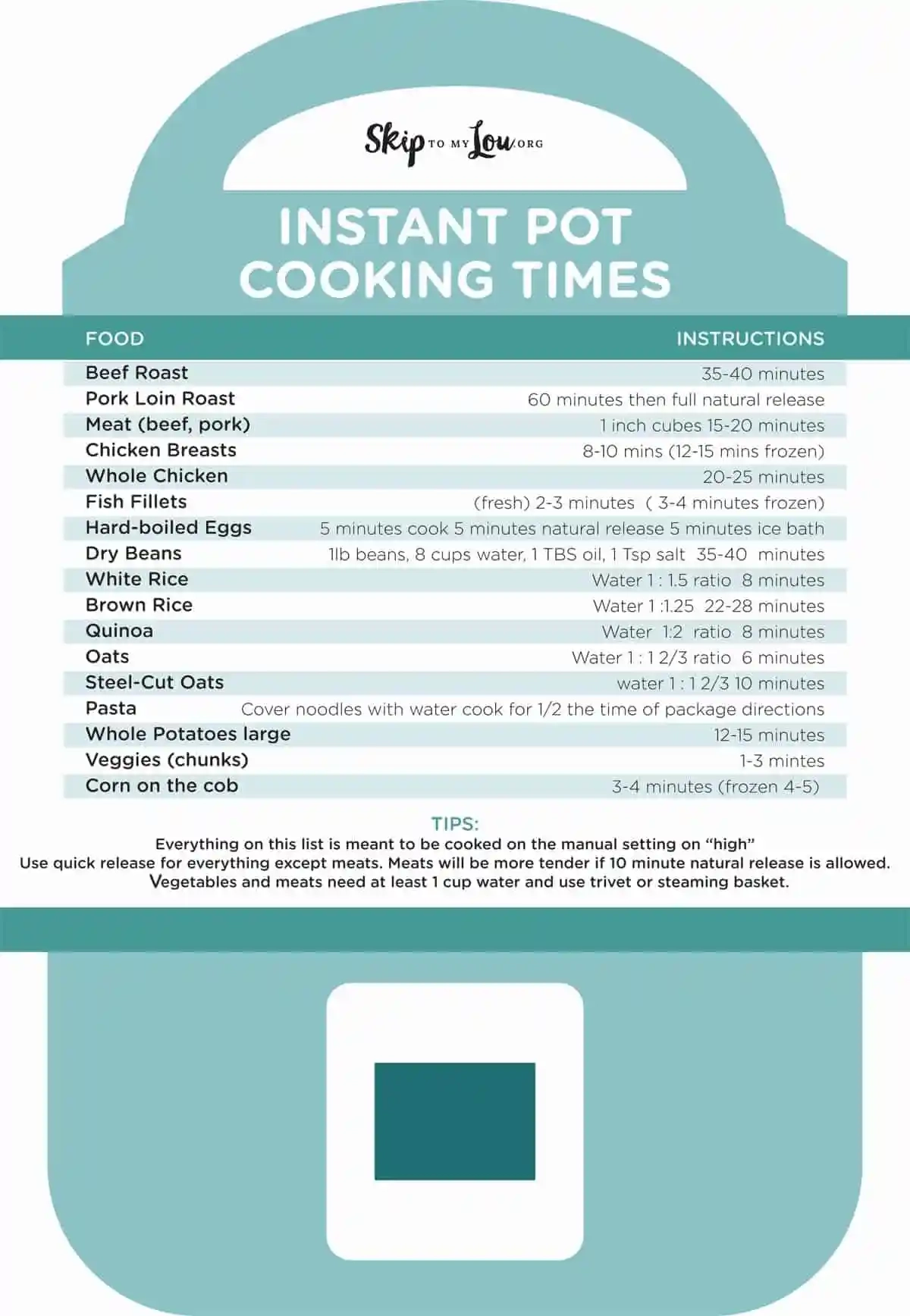 Instant Pot Cheat Sheet Printable