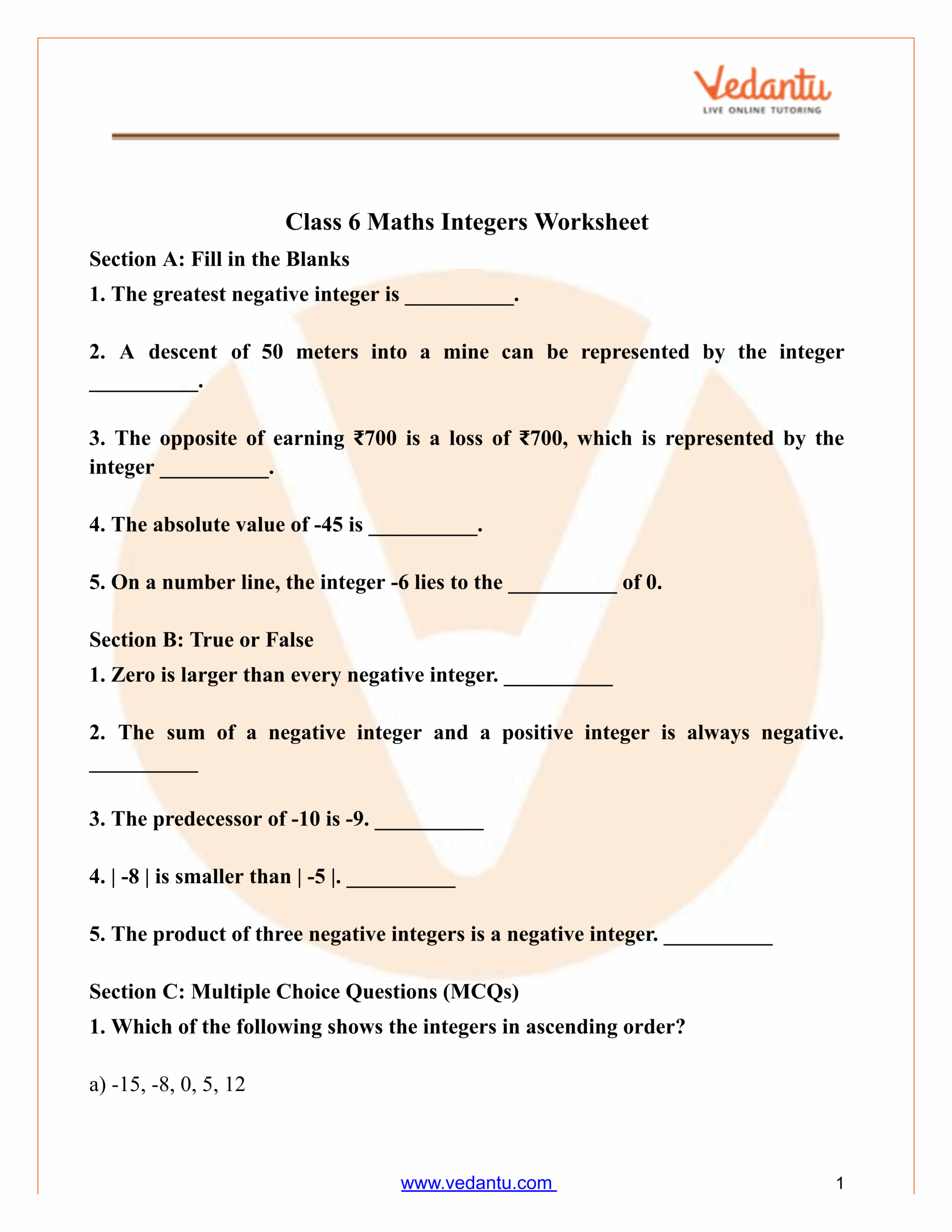 Worksheet On Integers For Class 6 With Answers Pdf Free With Answers