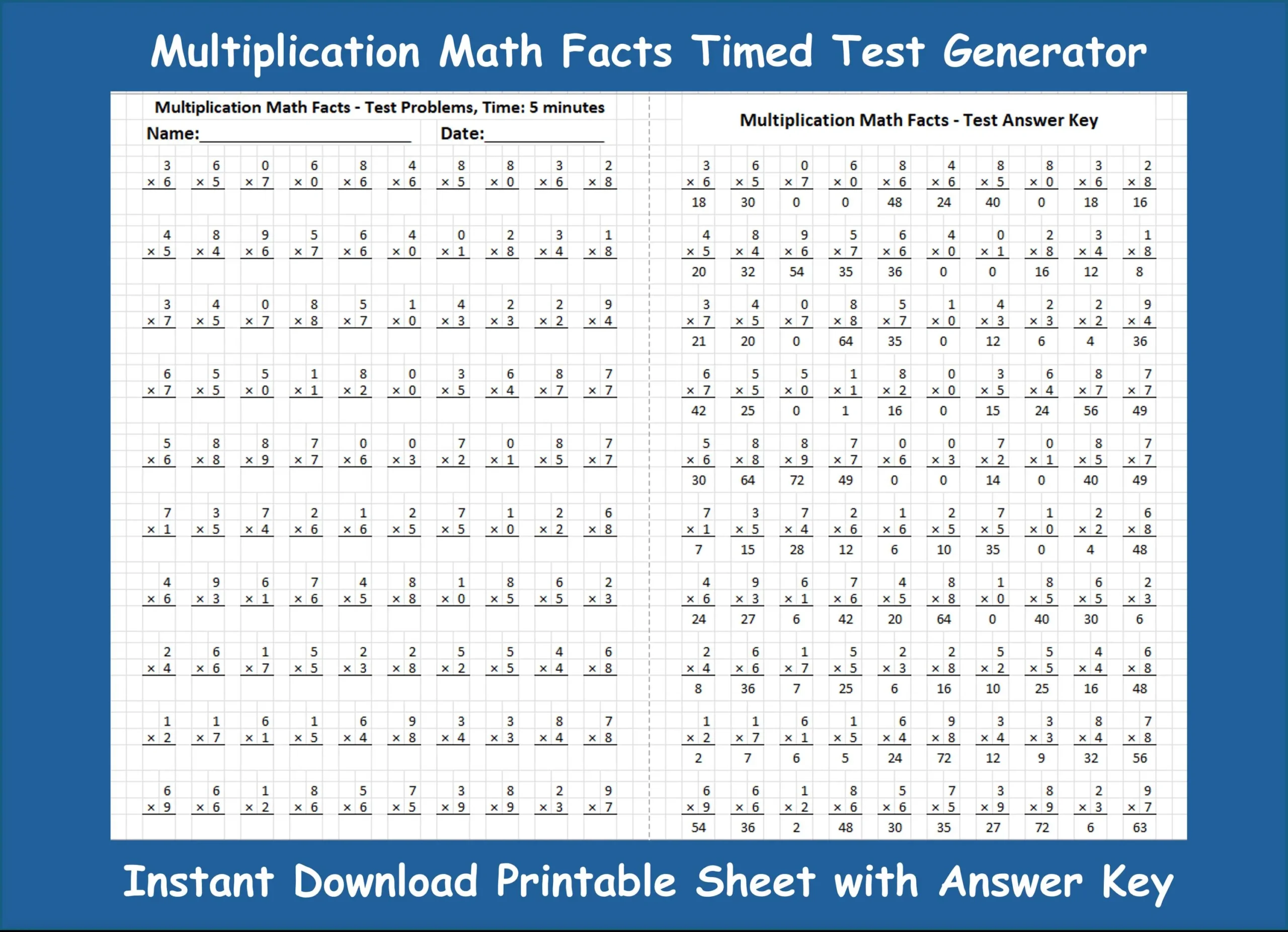 Multiplication Facts Worksheet Generator Printable Math Test excel Template Etsy