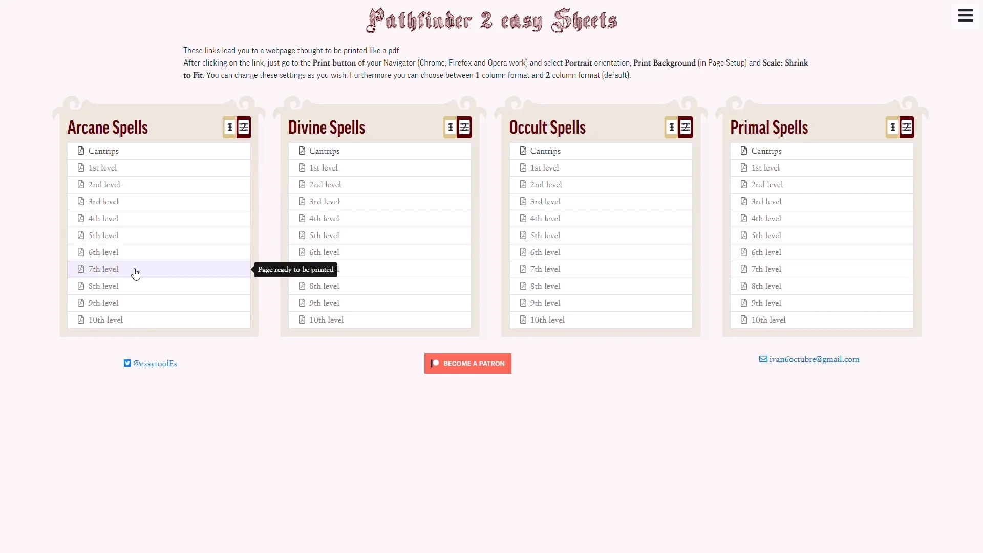 Pathfinder Spell Lists Printable